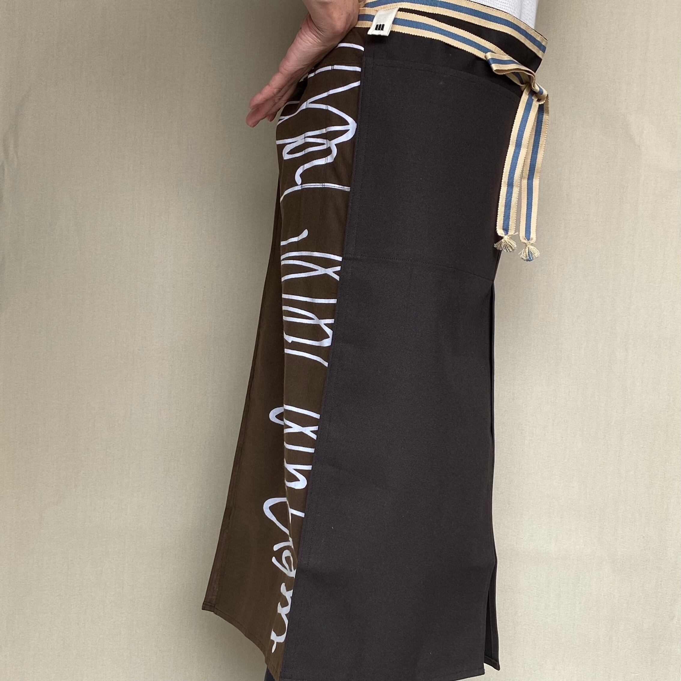 "膝下まである長めの丈の前掛けになります。前が割れているので膝をつくようなガーデニングなどにもご使用できます。前はふたつのポケット、また脇の手ぬぐい部分もポケットになっています。